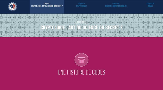 « À l’heure du tout numérique (ou presque), la sécurité des systèmes d’information de tout notre écosystème est garante de la confiance accordée aux technologies actuelles et à venir. Messagerie électronique, e-commerce, procédures en ligne et cartes à puce sont autant d’applications de tous les jours à travers lesquelles vous recourrez, plus ou moins consciemment, à des moyens de cryptographie, mesures de sécurité au premier rang desquelles figure le chiffrement. Mais que se cache-t-il derrière ces usages ? Quelles sont les technologies à l’œuvre ? Sur quoi planchent les experts ? Que nous réserve encore cette science plusieurs fois millénaire ? C’est ce à quoi tente de répondre ce web-documentaire en présentant de manière simple et interactive quelques-unes des facettes de la cryptologie. »