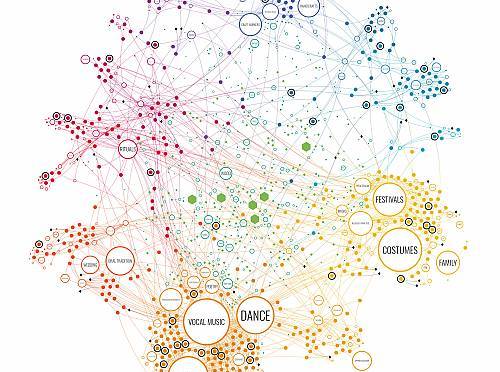 À l’aide du web sémantique et de visualisations graphiques, « Plongez dans le patrimoine culturel immatériel » propose une navigation conceptuelle et visuelle à travers près de 500 éléments inscrits sur les Listes de la Convention de 2003 de l’UNESCO. L’interface explore les éléments par domaine, thème, zone géographique et écosystème et permet de visualiser entre eux des liens profonds (en savoir plus sur la conception de ce projet).