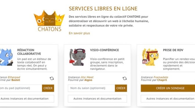 Le collectif “Les Chatons” a mis en place une page regroupant une dizaine de services libres en ligne utilisables pendant la période de confinement pour le travail à distance.