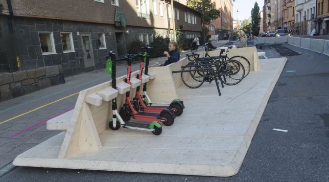Avec le cabinet de design Lundberg Design, Vinnova a mis au point un kit de mobilier urbain, conçu pour s’adapter aux dimensions d’une place de parking standard et construit en pin résistant. Ces panneaux, insérés dans l’espace en bordure de trottoir, peuvent être équipés selon les besoins de jardinières de sièges, de supports pour vélos ou scooters, d’espaces de jeux pour enfants ou de stations de recharge pour voitures électriques. Facilement connectables, les panneaux peuvent être soit des unités autonomes, soit configurés pour border une rue entière.