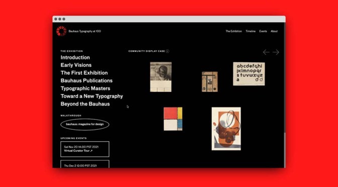 Bauhaus Typography at 100 est une riche exposition en ligne conçue par Jon Sueda et chris hamamoto. Le site comprend des centaines d’images, de vidéos et d’autres présentations multimédias, et d’autres contenus interactifs seront disponibles pendant la durée de l’exposition. Vous pouvez même ajouter vos objets Bauhaus préférés à la vitrine communautaire sur la page d’accueil.