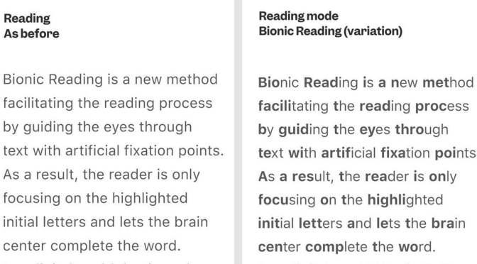 Renato Casutt, designer et typographe suisse, a mis au point une technique qui permettrait de lire (et comprendre) un texte plus efficacement. Son nom : « bionic reading », ou la « lecture bionique » en français. Elle consiste à mettre la ou les premières lettres d’un mot en gras pour créer des points de fixation. Ces derniers aideraient l’œil à survoler rapidement le texte pendant que notre cerveau fait le reste. « Le bionic reading crée des points de fixation artificiels qui permettent de guider le regard. Par conséquent, le lecteur se concentre sur ces lettres et laisse le cerveau compléter le mot », peut-on lire sur un site dédié.