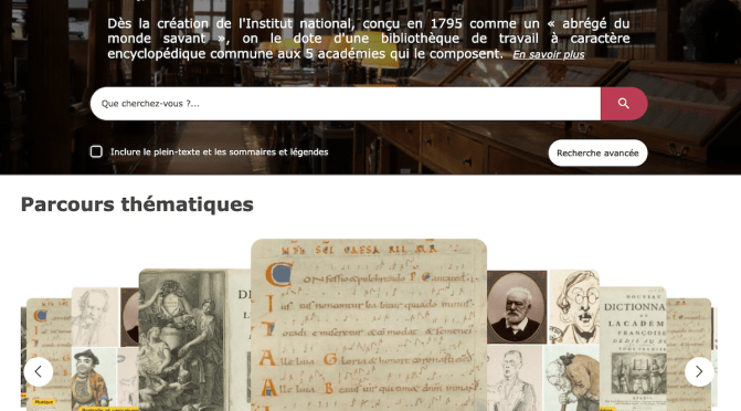 L’Institut de France, qui réunit cinq académies, dont l’Académie française, et plusieurs institutions, ouvre ses bibliothèques numériques. Ce catalogue fédéré offre un module de recherche dans les collections et fonds numérisés de huit bibliothèques, fondations, académies ou musées rattachés à l’Institut de France.