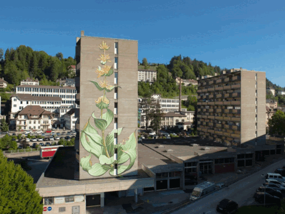 « Libère-toi de tes carcans et renais aussi résistante qu’une mauvaise herbe. » Cette devise, Mona Caron l’a faite sienne à travers la création depuis plusieurs années d’un incroyable herbier urbain. À San Francisco où elle réside et dans le monde entier, cette street-artiste suisse peint d’immenses herbes folles et sauvages — des gentianes, des asclépiades, des salicornes — qui partent à la conquête des immeubles. Un travail à la fois de titan — certaines œuvres dépassent les 50 mètres de haut —, et de fourmi, pour sculpter le drapé d’un pétale ou le détail d’un pistil.