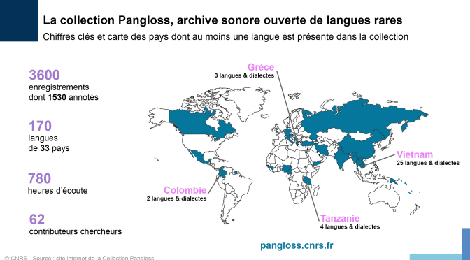 La collection Pangloss offre, en libre accès, des documents linguistiques sonores, avec une spécialité de langues rares ou peu étudiées. Son but est de contribuer à la documentation et à l’étude du patrimoine humain que représentent les langues du monde. Les documents que le visiteur peut consulter (et télécharger) ici sont le fruit du travail patient de linguistes professionnels qui œuvrent à la collecte, l’étude et la sauvegarde d’un patrimoine linguistique mondial. Cette tâche présente un caractère d’urgence, car la diversité des langues connaît un déclin rapide, parallèle au déclin de la biodiversité. Chaque langue qui disparaît emporte avec elle un univers de connaissances. Comme la biodiversité, la diversité linguistique est une richesse à préserver et entretenir pour répondre aux défis du présent.