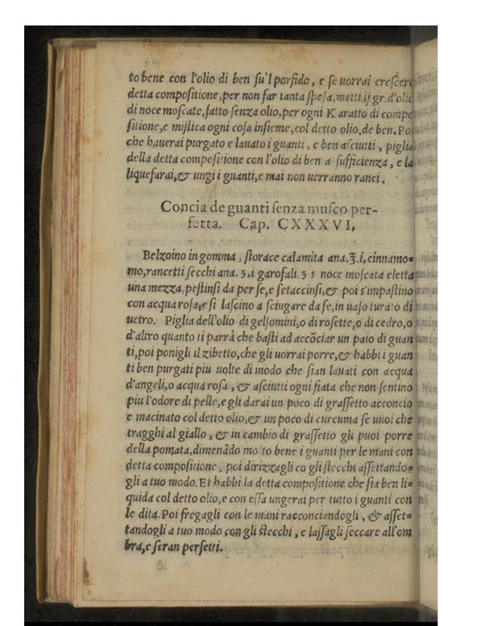 et écrivaine. La page ci-contre présente une recette intitulée « Concia de guanti senza musco perfetta » [Tannage de gants sans musc parfait]