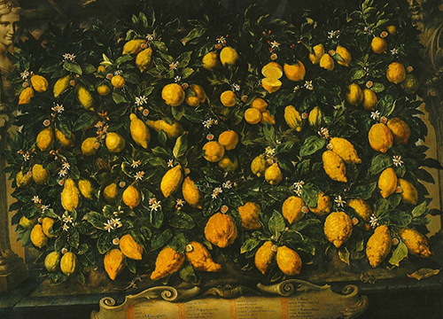 L’univers sensoriel de l’enfance de Léonard est évoqué ici par des plantes et arbres emblématiques de la Toscane et des jardins florentins : citronnier, oranger, olivier…