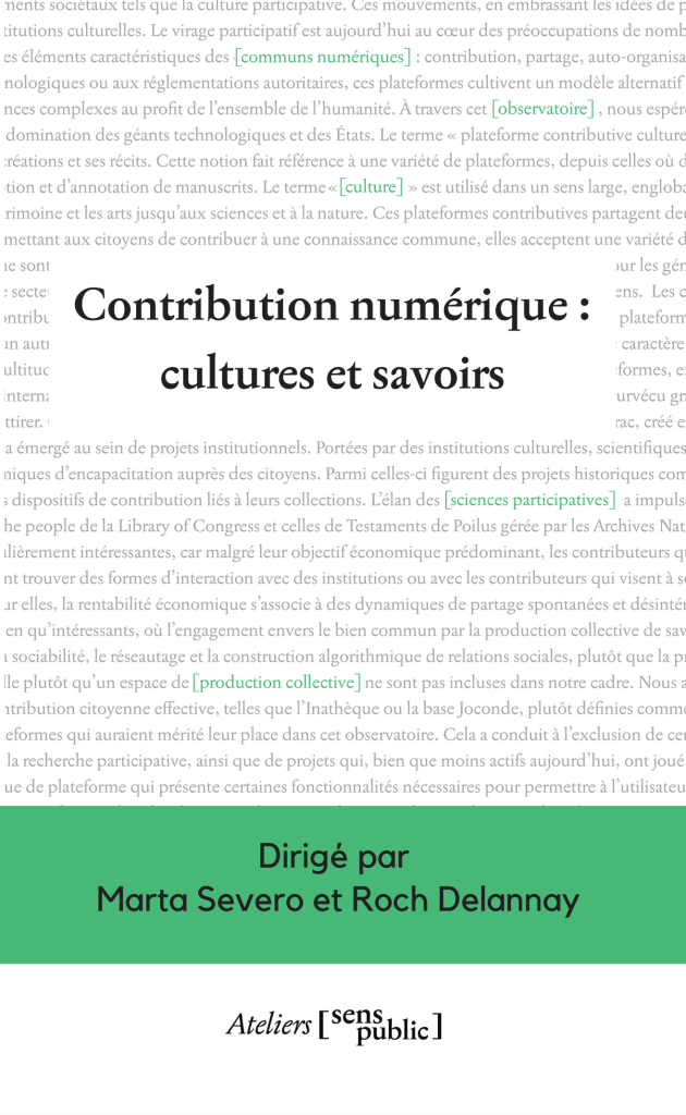 Le défi de l’ouvrage Contribution numérique : cultures et savoirs est de restituer non seulement le contenu des échanges nés lors de cette rencontre, mais aussi l’esprit de cette journée et d’un réseau de dialogue naissant. Sont présentés ici les retours d’expérience de divers acteurs de terrain concernant les expérimentations de contribution numérique réalisées dans le cadre de leurs missions.