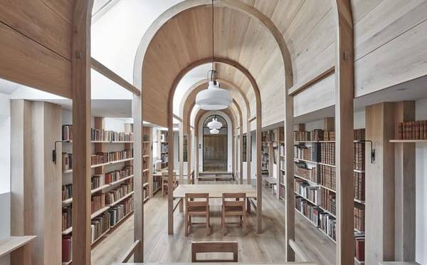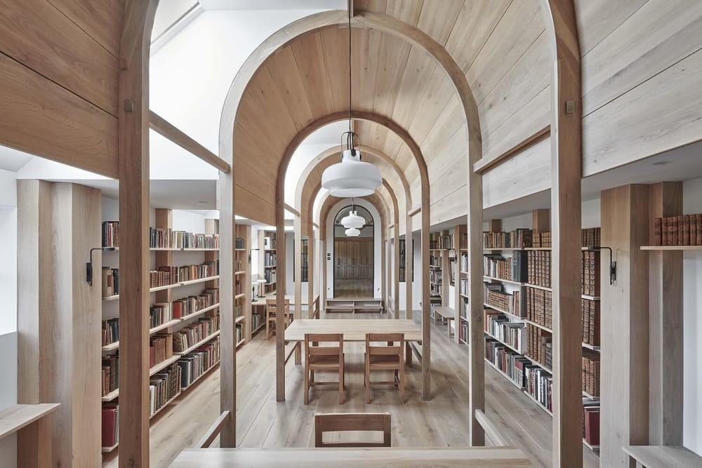 Cette bibliothèque privée, qui fait partie d’un complexe de moulins comprenant des jardins à la française et une résidence, a fait le tour de l’internet lorsqu’elle a été achevée en 2021. Initialement une étable, puis un entrepôt agricole, la nouvelle conception du bâtiment, avec son chêne non verni, rappelle délibérément des précédents classiques tels que la Long Room du Trinity College à Dublin.