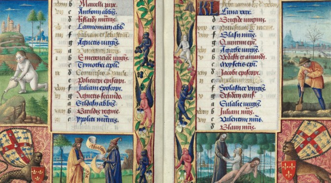 dans l’Europe médiévale, de riches mécènes ont vu des calendriers à l’intérieur de livres d’heures décrits comme des « best-sellers médiévaux ». Ces manuscrits servaient de livres de prières et comportaient des enluminures richement colorées qu’un mécène pouvait commander sur mesure, montrant souvent les activités associées à chaque saison. Les livres s’ouvraient souvent sur un calendrier énumérant les fêtes religieuses, puis les pages suivantes présentaient les jours les plus importants de chaque mois. Un folio du milieu du XVe siècle provenant d’un livre d’heures créé en France énumère les fêtes religieuses du mois d’avril et comprend des images du signe du zodiaque du Taureau et d’une femme tenant une fleur.