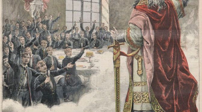 Le mythe de saint Charlemagne, patron des écoles, est alors en passe de devenir une » vérité historique « , que même l’histoire positiviste, retranchée derrière les documents authentiques, n’arrive pas à remettre en question. Seul l’aspect religieux du personnage commence à être gênant avec la montée de l’esprit laïque. Dans les collèges et lycées, la fête du 28 janvier se transforme alors en une cérémonie de félicitations pour les bons latinistes, suivie d’un banquet.