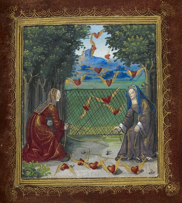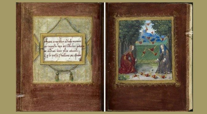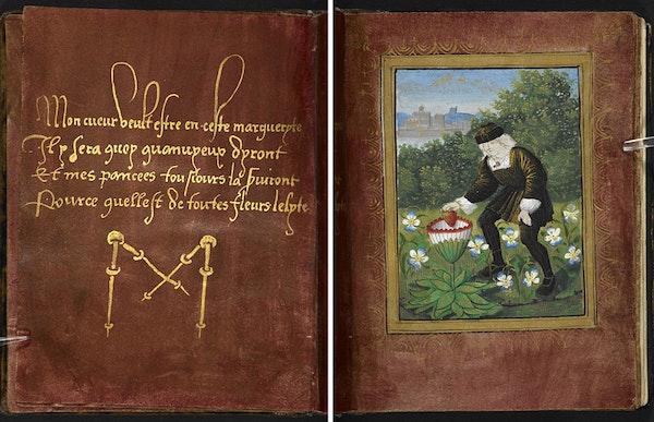 Cadeau de Saint-Valentin par excellence, le Petit Livre d’Amour est un livre orné sur mesure offert par le poète lyonnais du XVIe siècle Pierre Salas à son amante et future épouse Marguerite Bullioud. Il mesure à peine 5 pouces sur 3,7 pouces, a été écrit à la main par Salas à l’encre d’or et magnifiquement enluminé par un artiste identifié comme le « Maître de la Chronique scandaleuse« .
