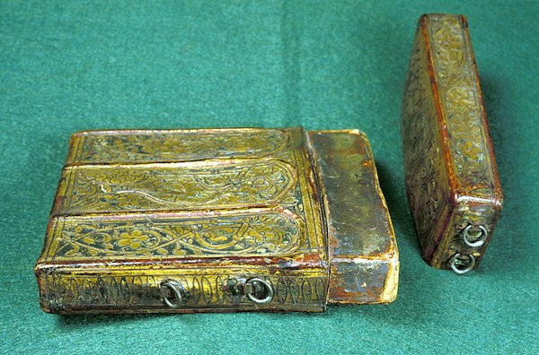 L’ouvrage a été conservé avec son petit étui de rangement muni d’un couvercle emboité, en bois couvert de cuir bouilli vert doré et gravé (dimensions 13,3 cm par 11,1 cm). L’ornementation dessine des fleurs à cinq pétales sur lesquelles se superposent les majuscules M et P, initiales de Marguerite et Pierre. Quatre petits anneaux métalliques sur chaque tranche de l’étui permettaient de le suspendre et de le porter à la ceinture