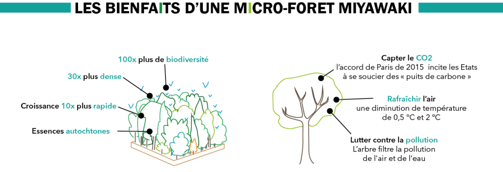La méthode Miyawaki consiste à recréer la végétation naturelle potentielle d’un site au travers d’indices contenus dans le sol. Les graines des essences autochtones identifiées sont élevées en pépinières dans des conditions d’acclimatation proches du futur environnement et plantées extrêmement densément sur site, de manière aléatoire, pour favoriser les processus de sélection et de coopération observés à l’état naturel. Après trois ans, la forêt est entièrement autonome et n’a plus besoin d’entretien.