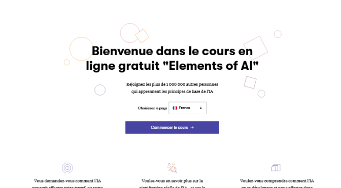 « Elements of AI » sont une série de cours en ligne gratuits créés par MinnaLearn et l’Université d’Helsinki, chechant à encourager un groupe de personnes aussi large que possible à apprendre ce que signifie l’IA, ce qui peut (et ne peut pas) être fait avec l’IA, et comment commencer à créer des méthodes d’IA. Les cours combinent théorie et exercices pratiques et peuvent être complétés à votre propre rythme.