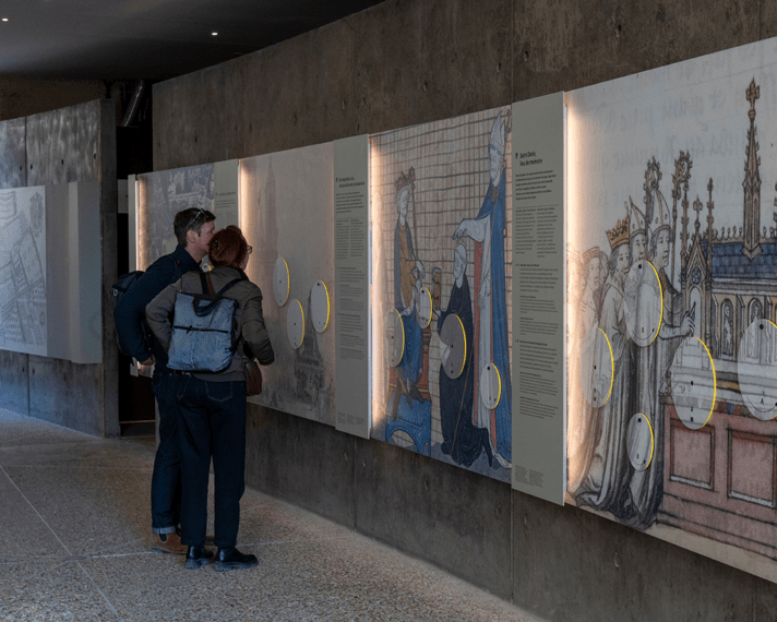 Ce nouvel espace accueille également une maquette, désormais augmentée d’une projection pour comprendre le développement et la structure du bourg et de l’abbaye au XVIIe siècle. Cette médiation est complétée par une grande fresque murale abordant plusieurs thèmes (le sacre des reines, les pèlerinages, Saint-Denis comme lieu de mémoire, de Napoléon à la restauration de la Monarchie, la basilique contemporaine) et composée de nombreux œilletons et de volets à ouvrir et pour y découvrir des iconographies cachées, en lien avec chaque thème.