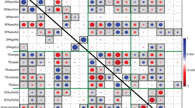 Ce graphique retrace l’évolution des stratégies de transmission culturelle utilisées pour faire perdurer 103 grandes innovations – telles que la fabrication d’outils en pierre, la maîtrise du feu, ou la création d’objets symboliques – depuis 3,3 millions jusqu’à 10 000 ans avant le présent. L’image se divise en trois volets correspondant à autant de dimensions de la transmission : (a) Dimension spatiale : degré de proximité ou d’interaction active entre l’apprenant et l’individu expérimenté ; (b) Dimension temporelle : durée et structuration de l’apprentissage (répétition, apprentissage en séquences ou en modules) ; (c) Dimension sociale : mode de circulation du savoir au sein du groupe (transmission généralisée ou filtrée selon le statut, l’âge ou le lien social). Chaque ligne correspond à une innovation regroupée par période chronologique. Les cases colorées indiquent, du rouge (stratégie principale) au bleu foncé (stratégie peu pertinente), les modes de transmission mobilisés pour chaque trait culturel. Cette cartographie visuelle permet de suivre l’évolution conjointe des cultures humaines et des moyens de les transmettre, jusqu’à l’émergence de formes complexes de langage.