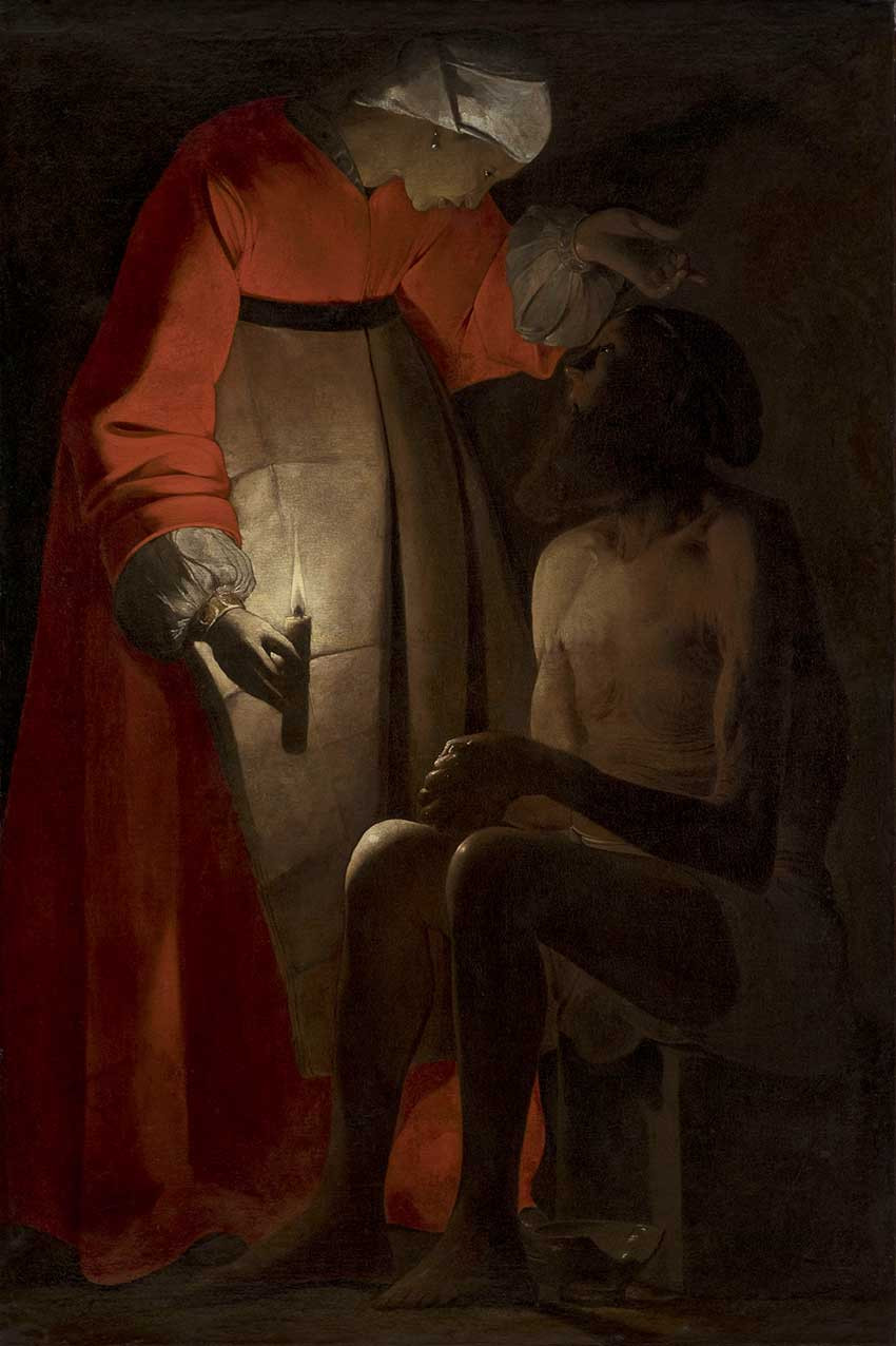 Une autre grande partie sera dédiée aux scènes nocturnes éclairées à la chandelle qui ont fait la renommé de Georges de La Tour, et où se fait ressentir le plus instinctivement la filiation artistique avec Le Caravage (1571-1610). En ce sens, les spectateurs pourront par exemple contempler Le Nouveau-Né (vers 1645) du musée des Beaux-Arts de Rennes, Job raillé par sa femme (vers 1630) du musée départemental d’Épinal, la Femme à la puce (vers 1632-1635) du musée lorrain ou encore La Madeleine pénitente (135-1640) de la National Gallery of Art de Washington.