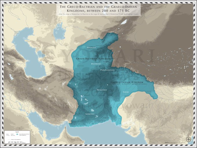 Ne pouvant perdre la face devant ses hommes, Antiochos signe et franchit l’Hindu Kush avec l’objectif de faire un énorme butin sur les royaumes indiens autrefois soumis par Alexandre. Dans le sillage triomphant du Séleucide, Démétrios en profite alors pour annexer ces royaumes de l’Indus où vivent encore des dizaines de milliers de colons grecs installés par le Conquérant 130 ans plus tôt. Ainsi naît un empire de plus d’un million de km2 allant de l’Ouzbékistan au nord-ouest de l’Inde, poussant pendant quelques années jusqu’à Pataliputra, plus de 1300km à l’est du point le plus oriental atteint par Alexandre ! Démétrios apparaît dès lors sur ses monnaies affublé d’un scalp d’éléphant et de l’épiclèse Aniketos (« Invincible »)