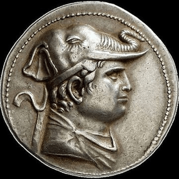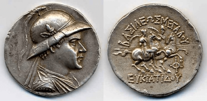 Au droit, le roi Eukratides, cuirassé, apparaît de profil et coiffé d’un casque attique à cimier orné de cornes et d’oreilles de taureau et d’un diadème dont le nœud retombe sur la nuque.