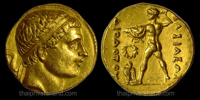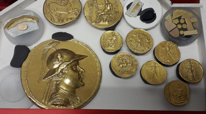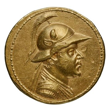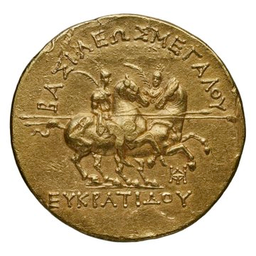 Au revers, les Dioscures caracolent avec des lances et des palmes de triomphe avec l’inscription BAΣIΛEΩΣ MEΓAΛOY EYKRATIΔOY ( du Grand roi Eukratides ) Son poids est de 170g d’or d’excellent aloi – c’est le poids d’un IPhone 16 – soit environ 20.000€ au cours actuel ou 3 mois de salaire pour un ouvrier grec du IIIe siècle av. J.-C. , mais son intérêt est d’abord historique, culturel et artistique.