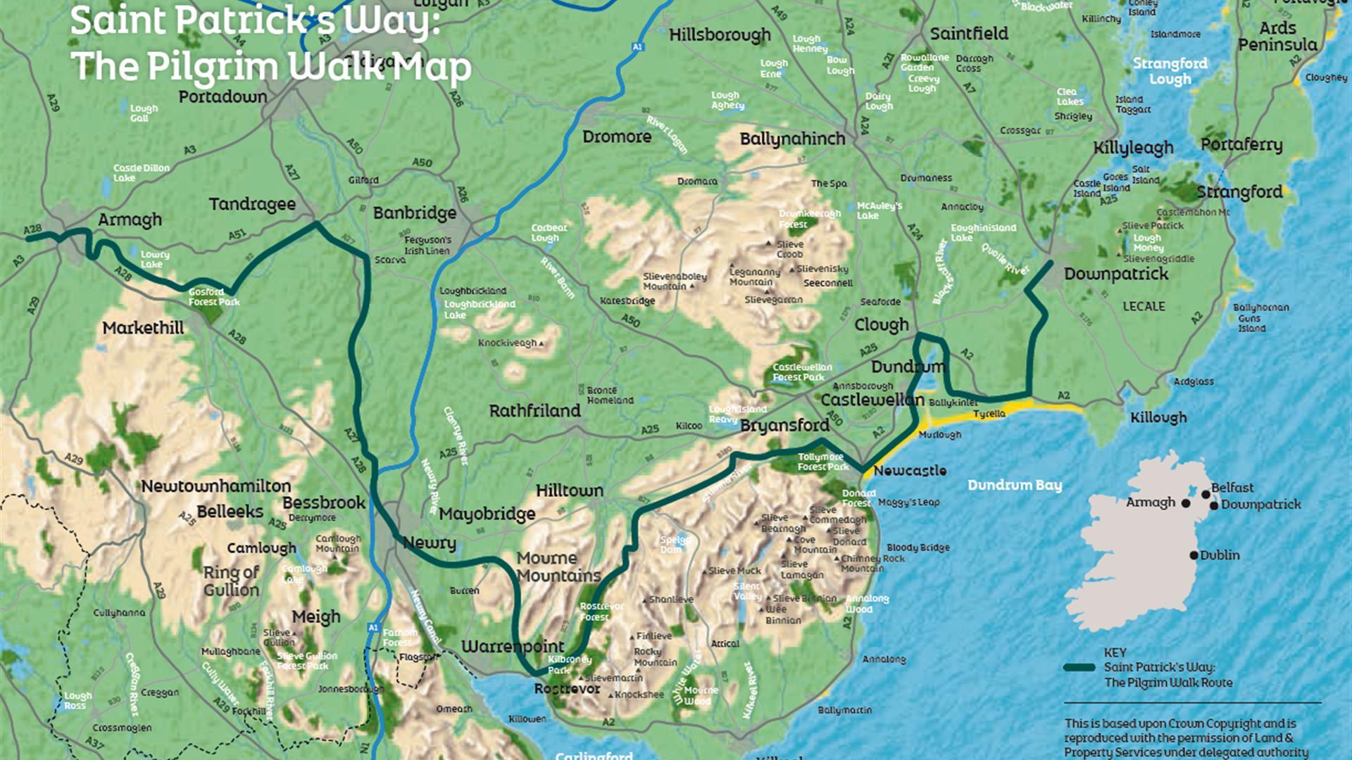 Le Chemin de Saint-Patrick commence au Navan Centre, près d’Armagh, longe le canal de Newry jusqu’à Newry, suit la côte jusqu’à Rostrevor, traverse ensuite les montagnes de Mourne jusqu’à Newcastle, pour se terminer à Downpatrick, dans le comté de Down, où repose Saint-Patrick.