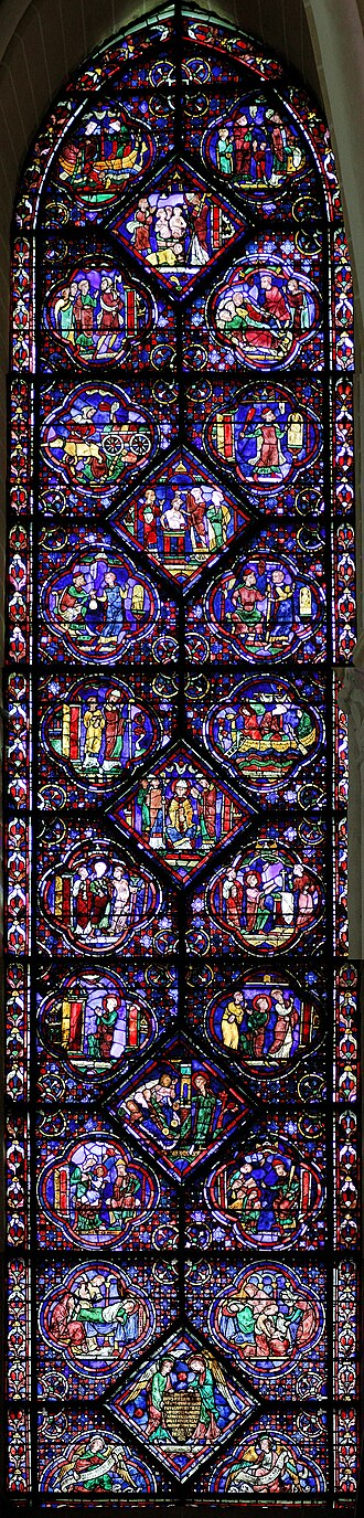 Le vitrail suit un manuscrit du XIIe siècle provenant de l’abbaye Saint-Laumer de Blois, dont l’abbé était chanoine de Chartres.