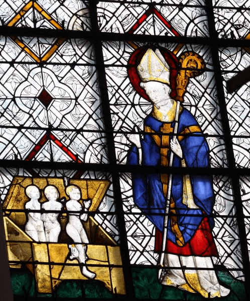 Les éléments dramatiques de la légende, le dépeçage, le thème même de la mort disparaissent aussi. Le vitrail ne montre que le saint traçant une bénédiction salvatrice, et trois « enfants » nus, gaillards, sortant du baquet comme s’ils sortaient de leur lit ; « innocents comme l’enfant qui vient de naître », ignorant tout du drame auquel ils échappent. C’est moins à une résurrection que nous assistons (puisque rien n’indique une mort préalable) qu’à un frais éveil sous l’influence du saint.