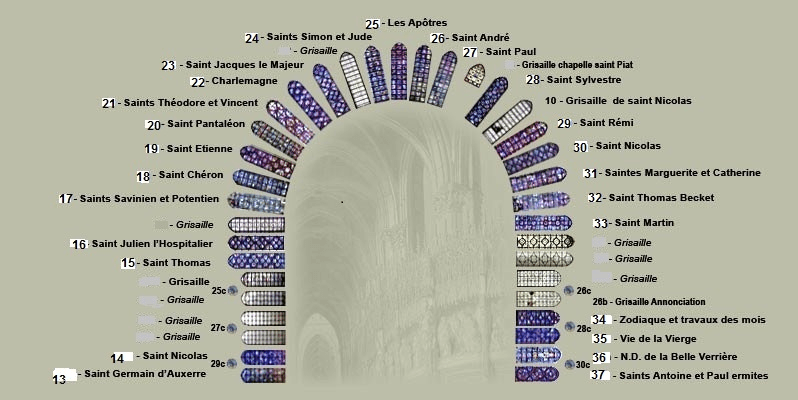 Nous passons des verrières 39 et 29a du début du XIIIe siècle qui comptent respectivement 20 et 27 panneaux, et de multiples scènes de la Vie du saint, à ce vitrail blanc aux deux ensembles colorés, le saint à droite, le saloir et ses trois occupants à gauche. Autrement dit, nous passons d’un récit d’une vie de saint (naissance, enfance, intronisation, miracles) peu ou pas lisible de loin (le miracle des trois clercs, par exemple, est au sommet du vitrail 29, invisible sans jumelles) aux personnages d’une vingtaine de centimètres, à un portrait d’un saint, d’un mètre de haut peut-être, parfaitement visible, et accompagné de son attribut distinctif, le saloir aux enfants.