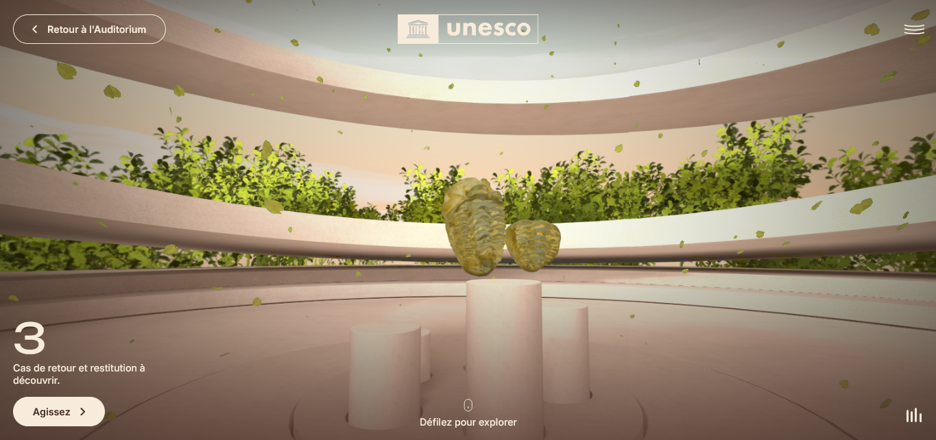 Auditorium : Cette partie du musée constitue un espace de présentation du musée virtuel, dédié à la diffusion de contenus éducatifs et institutionnels (notamment sur la Convention de 1970 qui encadre la lutte contre le trafic illicite). Cet espace illustre la dimension pédagogique du musée : il vise à informer et à sensibiliser les publics aux enjeux du trafic illicite, à la préservation du patrimoine et aux actions de coopération internationale.