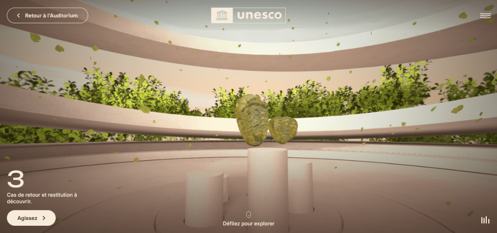 Salle Retour et Restitution : Cet espace valorise les efforts internationaux ayant abouti à la restitution d’objets culturels à leurs pays d’origine et documente des exemples de coopération entre États, musées, douanes et forces de police. Elle présente trois objets, des fossiles, qui ont été retrouvés au Chili puis restitués au Maroc en 2024. Alors que la Galerie des biens culturels volés est destinée à se vider, cette salle est amenée à se remplir au fur et à mesure des enquêtes et des restitutions.